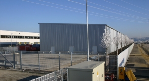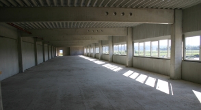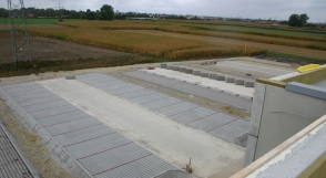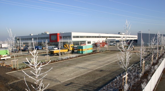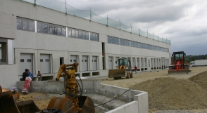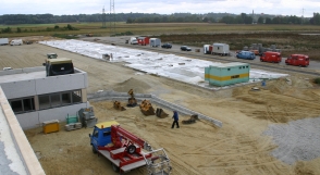 ![]() Stand 21.09.2004 Blick vom Dach auf die 2200 m2 betonierte Fläche für das Freiregallager |